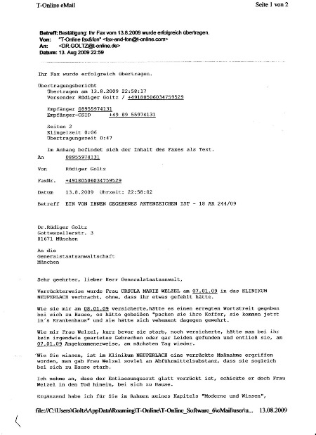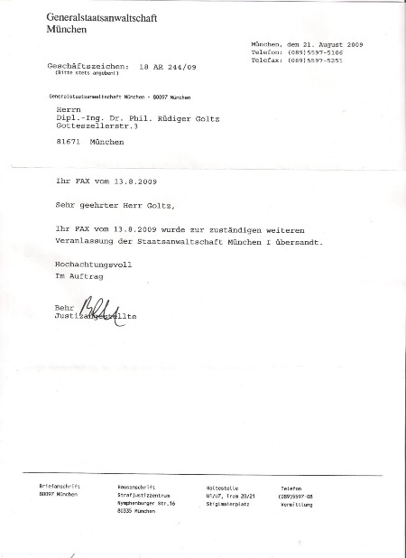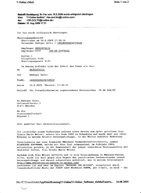 5) Am 06.01.09 wurde ihr Telefonanschluss seitens des Vormundschaftsgerichtes München auf "beinahe 110% geheim" abgeändert(davor-089 64248931). 6-Alfa) DIESES WERK VON UNS FASST MIT FRAU URSULA MARIE WELZEL GEMEINSAM ERARBEITETE ERGEBNISSE ZUSAMMEN, SIE BEDINGT ERWEITERND - ES DÜRFTE SICH ZU EINEM WISSENSSCHAFTLICHEM "SUPER URKNALL" ENTWICKELN. 6-beta) Unsere Forschungsergebnisse sind von vielen geprüft worden. 7-Alfa) EINE HABILITATION IM GEBIET "HEURISTIK" WURDE NACH BESAGTER EISIGER ERMORDUNG FÜR UNMÖGLICH GEHALTEN, WAS DURCHAUS BEABSICHTIGT GEWESEN WAR ( SIEHE DEN DIESBEZÜGLICHEN BRIEF VON DR.BUßMANN, CHEF BESAGTER RICHTERIN, AN MICH, AUS DEM JAHR 2007), ES BLIEB NUR DER WEG IN DIE ÖFFENTLICHKEIT, IN DIE WELT DES INTERNETS. 7-beta) Dieses Werk pflückt reichste Ernte ab. 8) U N S E R W E G Z U R N A S A - http://www.nasa.gov/ . 9) DAS MIT BESAGTER ERMORDETER FRAU WELZEL ERARBEITETE HINTERFRAGUNGSSYSTEM , HINTERFRAGT AUCH DIE JETZIGE DISTANZLEHRE IN DER ASTRONOMIE. SIE, ALSO URSULA MARIE WELZEL, WURDE MITTEN IM ABLAUF DES BESAGTEN FORSCHUNGSPROJEKTS ERMORDET. 10) ZWEI DER HOCHRANGIGSTEN RAKETENPIONIERE DER WELT, UNTER V O N B R A U N GEARBEITET HABEND, HABEN UNS BEGLEITET, EINER WAR CHEF DER PLANUNG IM APOLLO-MONDLANDEUNTERNEHMEN( Nr. 3 des APOLLO-PROGRAMMS ). 11) Der seitens einer Dame des Forschungsrates betreute BETREUER, HERR J. RAZ - MARKT SCHWABEN, bei München, teilte mir jüngst mit, dass im Fall der jüngst ermordeten Freundin von mir, "alle Gesetze aufzuheben seien". 12) Frau Ursula Marie Welzel wurde jüngst in der betont fahrlässig orientierten Anwendung einer Waffe jüngst ermordet. 13) Der Täter-die Täterin, beide laufen unbeschadet frei herum, in dieser Stadt, München. 14) Frau Welzel wurde von der hiesigen Münchner Ortspolizei bis auf´s Blut geschlagen, in kaum vorstellbarer Weise gequält von Teilen des bayerischen Regimes. I-b) Es wäre über andere, parallel gelagerte Fälle zu berichten, betreffend beispielsweise HERRN NORBERT BUSE, der mir kurz vor seinem Tod noch mitteilte, dass er Opfer sei, Opfer einer Staatsintrige allerschärfsten Kalibers. I-c) "DAS GERICHTSVERFAHREN BEIM EUROPÄISCHEM GERICHTSHOF FÜR MENSCHENRECHTE" 1) Während sie lebte, wurde von mir quasi erwartet zu schweigen, sogar ein offizielles,hochrichterlich unterzeichnetes Vortragsverbot seitens des Münchner Amtsgerichtes zu einem Thema von äußerst großer Tragweite erhalten habend. 2) Dagegen betont eilige Beschwerde eingelegt habend, ergab sich ein Verfahren gegen Deutschland, dreigliedrigerweise, beim höchsten Gericht EUROPAS, dem EGMR in Straßburg, Frankreich. aufgrund von Schreiben an mich des damaligen BUNDESPRÄSIDIAL-wie BUNDESKANZLERAMTES, jeweils im höchsten Auftrag- einige wenige Jahre her. 3) Der damalige höchste Repräsentant besagten Amtsgerichtes , Herr Präsident ZIERL, wurde von mir damals angezeigt, die GENERALSTAATSANWALTSCHAFT ermittelte, kam aber wenig voran und gab auf. I-d) "TEILE BAYERNS VERSUCHTEN ZU SCHADEN, WO SIE KONNTEN" I-d-1) "TEILE BAYERNS RÄCHTEN SICH " 1) An dieses Vortragsverbot mich eben nicht gehalten habend, "schlug ein großer Teil Bayerns bald in der grausamsten-erbarmungslosesten Weise zu". 2) STARKE BAYERISCH-STAATLICHE BANDEN WAREN AM WERKE. I-d-2) "ZUR ANGEORDNETEN FOLTER" 1) "Man könne mit uns keinen Blumentopf gewinnen", wurde von gerichtlicher Seite, dem bayerischen Verwaltungsgericht, Frau Welzel entgegengehalten. 2) FRAU WELZEL starb an Folter-HERZVERSAGEN DÜRFTE DER LETZTENDLICHE TODESGRUND GEWESEN SEIN. I-d-3) "DER TÄTER LÄUFT FREI HERUM IN MÜNCHEN " Die Person, welche ihren einsamen Tod herbeizuführen gewusst hat, operiert weiter. I-d-4) "SCHARMÜTZEL" 1) Eine Person des hiesigen Münchner ( MÜNCHEN-PASING) Polizeiwesens, welche einst ihr Blut in horrenden Massen strömen ließ (sie wurde danach in´s Krankenhaus gefahren und besagte Polizei drohte mir an, dass ich "auf die Schnauze fallen würde", sollte ich beeiden, wie es geschah), wurde von einem polizeilichen Kollegen "abrupt zum Schweigen gebracht", daraufhin. 2) HERR POM BIELER VON DER PDS MÜNCHEN-PASING ÜBERFIEL MIT EINEM KOLLEGEN ENDE 2006 EINE PASINGER WOHNUNG, NIMMERFALLSTR.72-bei Weber, IN DIE SICH DIE JÜNGST ERMORDETE FRAU WELZEL GERETTET HATTE, SIE GEGEN SCHRIFLICH VORGELEGTE WEISUNG DES BERLINER BUNDESMINISTERIUMS FÜR BILDUNG UND FORSCHUNG ZUR STRENG GEHEIMEN FOLTER ABFÜHREN LASSEND. I-d-5) "FELDZUGARTIGES GESCHEHEN" 1) Auf Grund höchstrichterlicher Weisung (im Auftrag des Münchner Amtsgerichts- Frau Amtsgerichtsrichterin BIRKHOFER-HOFFMANN gab an, dass sie zum Telefonhörer gegriffen hätte, um die Katastrofe zu entfesseln), gab es kurz vor Weihnachten 2006 "gnadenlose Kämpfe" an der sich durchbiegenden SCHWABINGER Wohnungstür der MÜNCHNER Wohnung, in der ich mit der jetzt Ermordeten zu leben gewusst habe. 2) Polizei kam, versuchte die sich durchbeulende Wohnungstür aufzustemmen, ich kämpfte an besagter Tür mit der Kraft der wilden Bestie( ich glaubte emordet werden zu sollen ) gegen mehrere Polizisten, welche sich von außen würdelos anstemmten, die Tür gab nach und " MEHRERE PERSONEN DER POLIZEI STÜRMTEN DIE SCHWABINGER WOHNUNG". 3) Im übrigem ist noch zu erwähnen, dass währenddessen draußen vor der Tür jemand "wütete", die Tür beulte sich ja, ich den Polizeinotruf zu betätigen wusste. 4) Die Polizei klopfte nicht an unserer Wohnungstür,geschweige denn, dass geklingelt wurde -"DER STURM BRACH OHNE JEDE VORWARNUNG LOS". I-d-6) "DER WIEHERNDE AMTSSCHIMMEL WUSSTE NICHT BESCHEID" Niemand beachtete, dass kein fachkundig zu vertretender Anlassgrund (ANWEISUNGSGRUND) für besagtes Geschehen da war, die Polizei entschuldigte sich - "die Tür sei immerhin noch verwendbar". I-d-7) "FOLTER - DANACH MORD" 1) Allerdings wurde meine Geliebte mir bei besagter Gelegenheit sozusagen "weggeraubt". 2) Sie wurde eilig aus dem Bett gezerrt, irgendwohin weggefahren, dort flüchtend,wurde sie erneut seitens der Polizei eingefangen (ohne jeden Ve